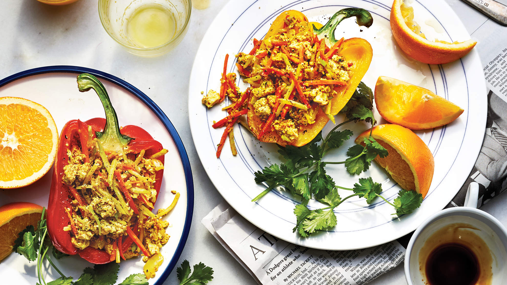 -pe o tavă acoperită cu hârtie de copt așezați ardeii roșii pe care îi veți umple cu mixul de legume și tofu . Băgați-i la cuptor și îi puteți lăsa până încep să prindă o crustă pe deasupra.