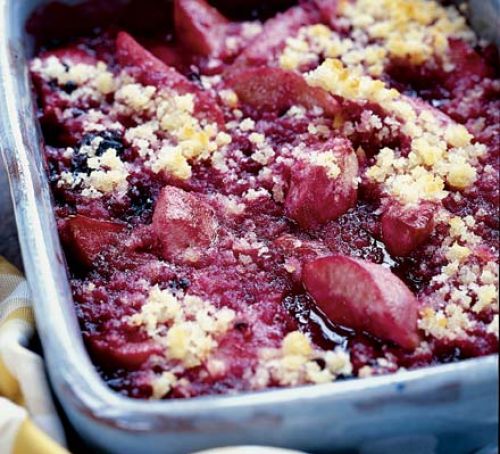 - într-un bol mixați : 350 de grame de fructe de pădure , 3 linguri de zahăr brun , 4 linguri de gem de afine fără zahăr ( o altă alternativă ar fi să treceți afinele prin blender și e de ajuns ) și 6 pere tăiate cubulețe.