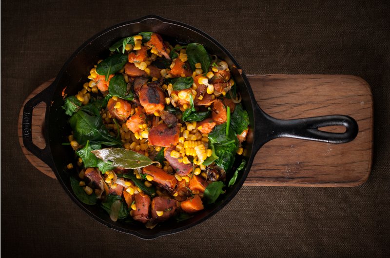- turnați cartofii dulci în tigaie alături de 1 cană de porumb dulce . Acoperiți tigaia pentru 5 -10 minute .