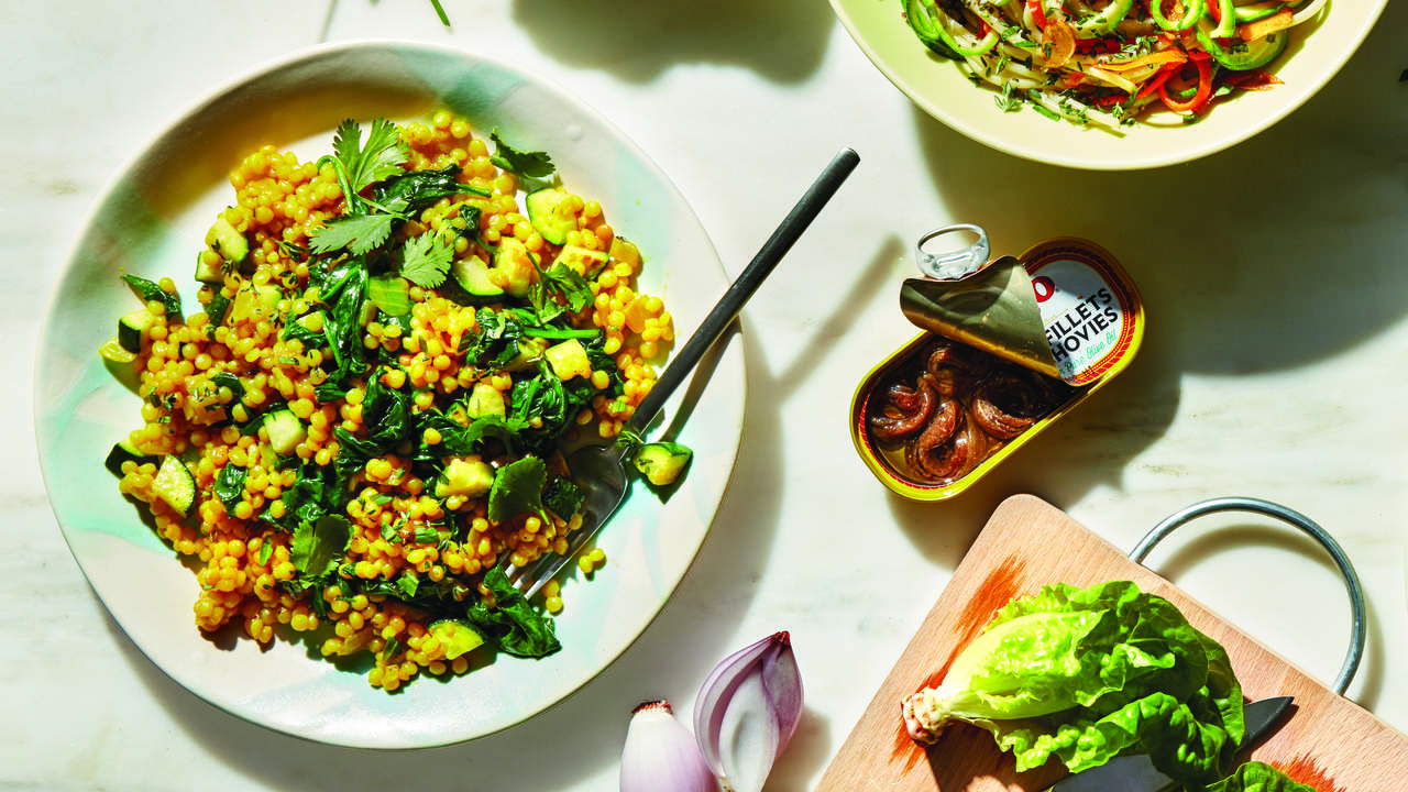 -turnați în tigaie 2 căni de apă , sare și piper. Așteptați până apa începe să fiarbă și couscous-ul să devină moale și continuați cu un dovlecel mediu feliat și 150 de grame de spanac tocat. Îl puteți lua de pe foc când legumele s-au fiert iar mâncarea este gata.