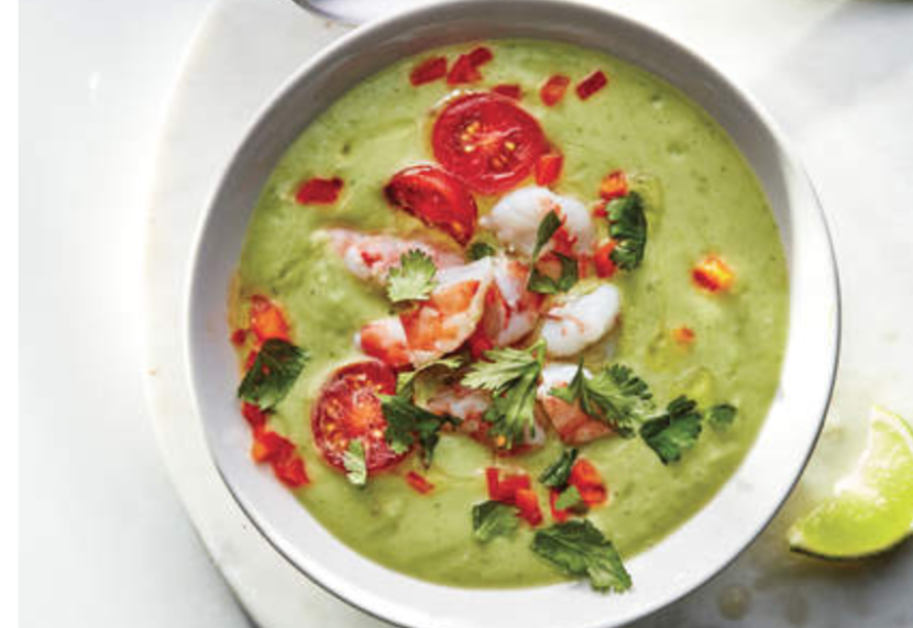 -într-un blender puneți următoarele : 2 căni de sifon , 2 linguri de oțet , 2 linguri de tarhon , o jumătate de linguriță de sare , 3 -4 roșii , 2 avocado curățați și tăiați cubulețe , 1 castravete și un jalapeno. Mixați până compoziția devine moale și când e gata , lăsați-o la frigider timp de o oră .