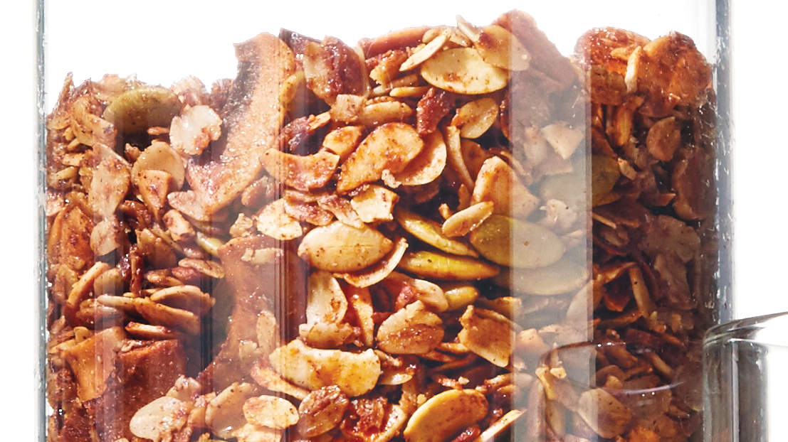 -într-un bol puneți următoarele : 2 căni și jumătate de ovăz , 2 căni de migdale tocate , 1 cană de semințe de dovleac , o jumătate de cană de fulgi de cocos , 1 lingură de scorțișoară și o linguriță de sare . Turnați peste ele 2 linguri de ulei și opțional 2 -3 linguri de sirop de arțar ( de agave sau alți îndulcitori)