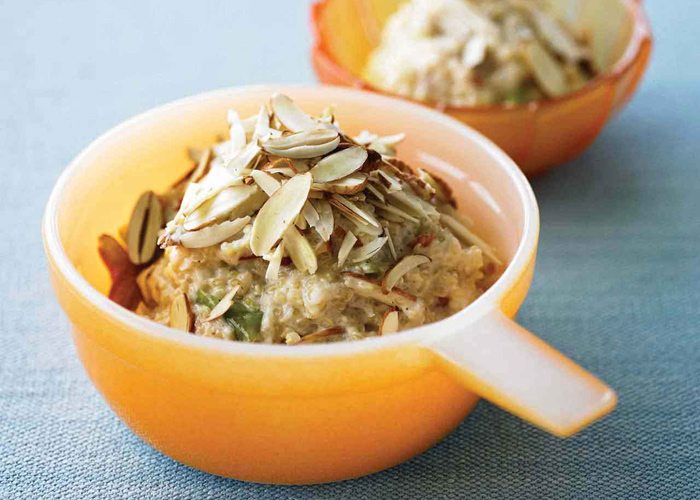Pune la cuptorul cu microunde bucățile de pară și mierea până se încălzesc (cam 3 minute). Adaugă amestecul la grișul preparat cu apă fierbinte. Presară migdalele peste iar desertul este gata.