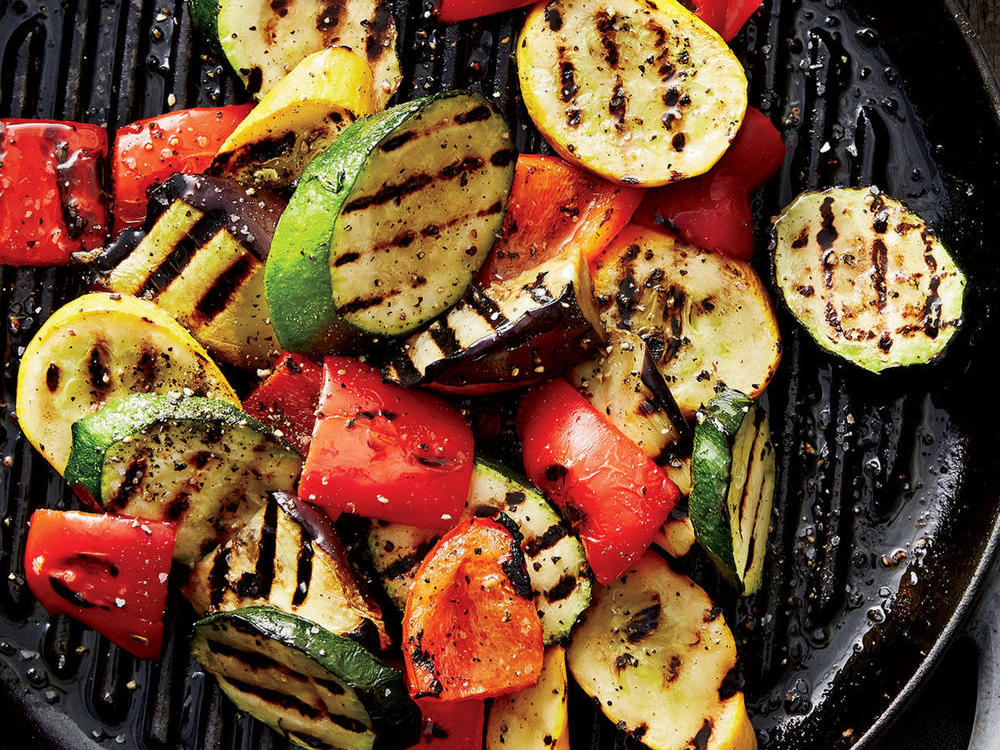 -puneți bolul deoparte și feliați următoarele legume : o vânătă , un ardei roșu și un dovlecel .Lăsați-le pe tigaie câte 10 minute pe fiecare parte