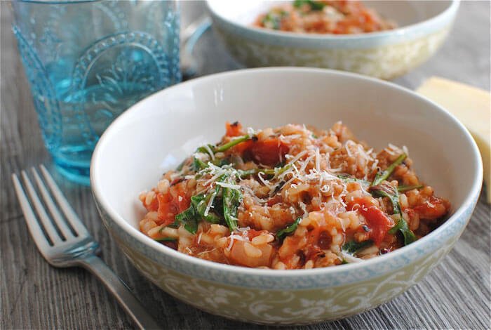 5. Cand orezul este aproape gata, adauga rosiile despielitate si taiate cuburi. Amesteca bine si adauga apoi spanacul, busuiocul si cantitatea ramasa de supa de pui.