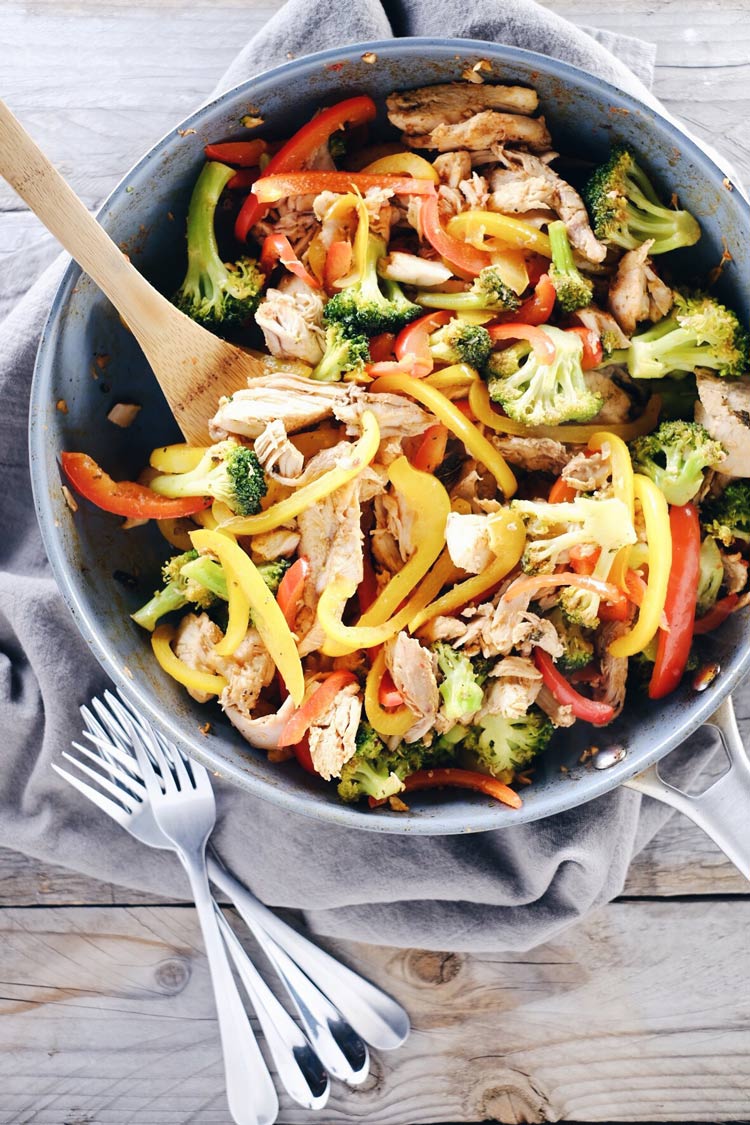 -în aceeași tigaie în care a-ți făcut curcanul adăugați : 1 ardei roșu și unul galben , 2 căni de broccoli . Turnați apa și așteptați până când legumele sunt gata și continuați cu bucățile de curcan . Dați la foc mare timp de 1 – 2 minute iar mâncarea este gata.