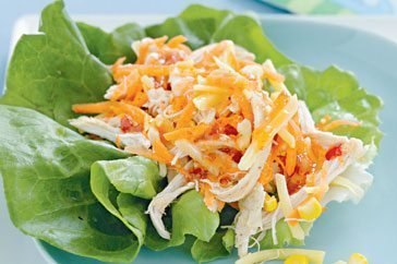 1. Amestecă morcovul ras, branza Ceddar, bucățelele de piept de pui și porumbul într-un bol.