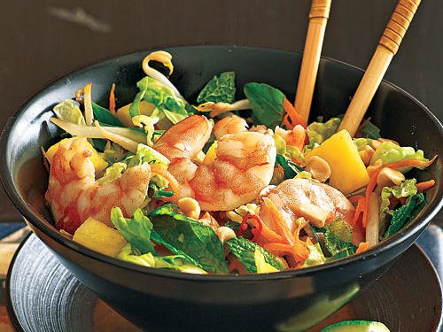 -pentru salată combinați într-un bol următoarele ingrediente : 2 căni de muguri de fasole , aproape jumătate de varză tocată mărunt , 1 cană de ananas tăiat cubulețe , 1 morcov dat prin răzătoare , un sfert de cană de frunze de mentă și de busuioc tocat mărunt