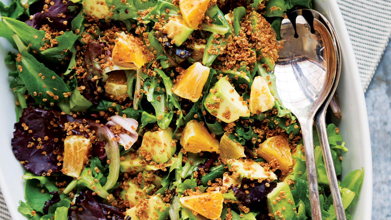 -între timp într-un bol puneți : 5 căni de mix de salată , 2 portocale tăiate cubulețe , 1 avocado curățat și tăiat , quinoa și jumătate de cană de ceapă verde