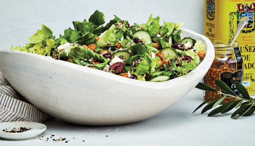 -când sunt gata , puneți-le într-un bol alături de: 1 lingură de suc de lămâie , 1 linguriță de oregano , quinoa fiartă , 1 andivă tocată , 1 castravete feliat , 2 – 3 pumni de brânză feta și o jumătate de cană de măsline . Amestecați cu totul iar salata este gata .
