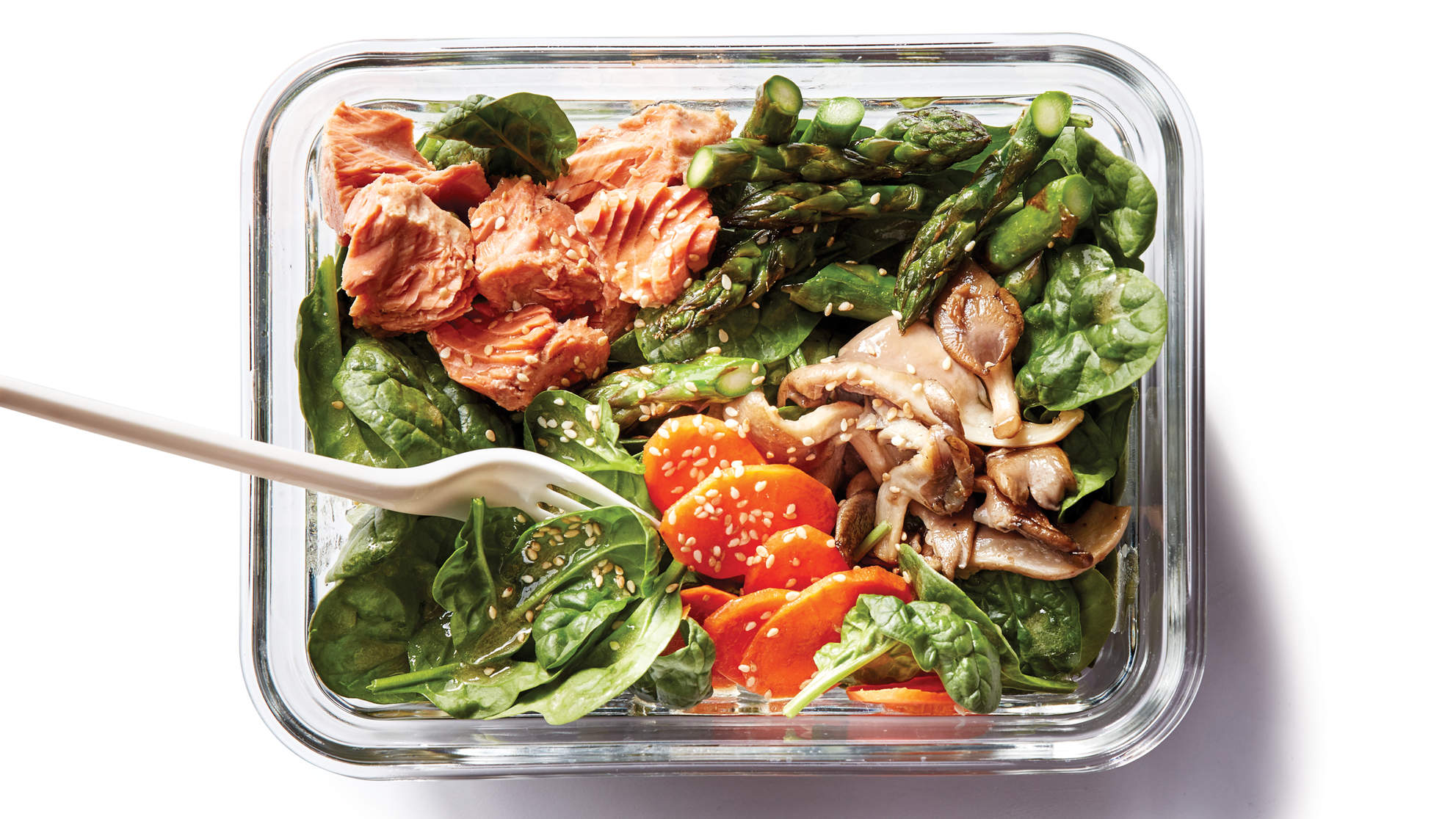 -când sunt gata într-un bol mai mare așezați : 55-60 de grame de spanac ,60-70 de grame de somon , sparanghelul , ciupercile și un morcov feliat . La sfârșit , turnați dressing-ul iar salata este gata.