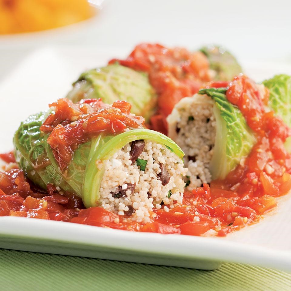 -între timp , luați câte o linguriță de brânză feta și una de măsline și adăugați-le în fiecare bulgăraș de couscous . Puneți-le pe foile de varză și rulați-le și strângeți bine ambele părți .