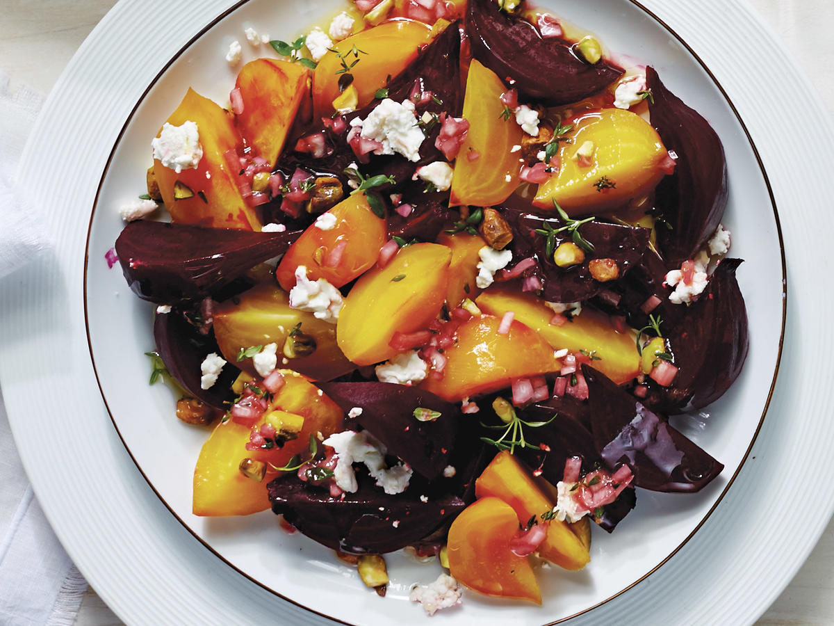-transferați atât rubarba cât și sfecla în farfurii . Înainte de a servi , puteți servi alături de câte 1 lingură sau două de brânză de capră și un pumn de fistic.