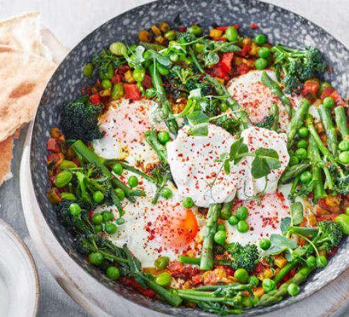 – faceți patru găuri în mix și spargeți câte un ou in fiecare parte. Lăsați la foc mediu până când ouăle s-au făcut.