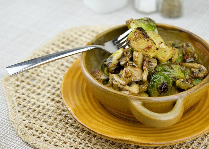 2. Separat, se topește untul la foc mediu. Se adaugă ciupercile și se gătesc până când devin maronii, după care se adaugă varză de Bruxelles, se presară pătrunjelul și zeama de lămâie.